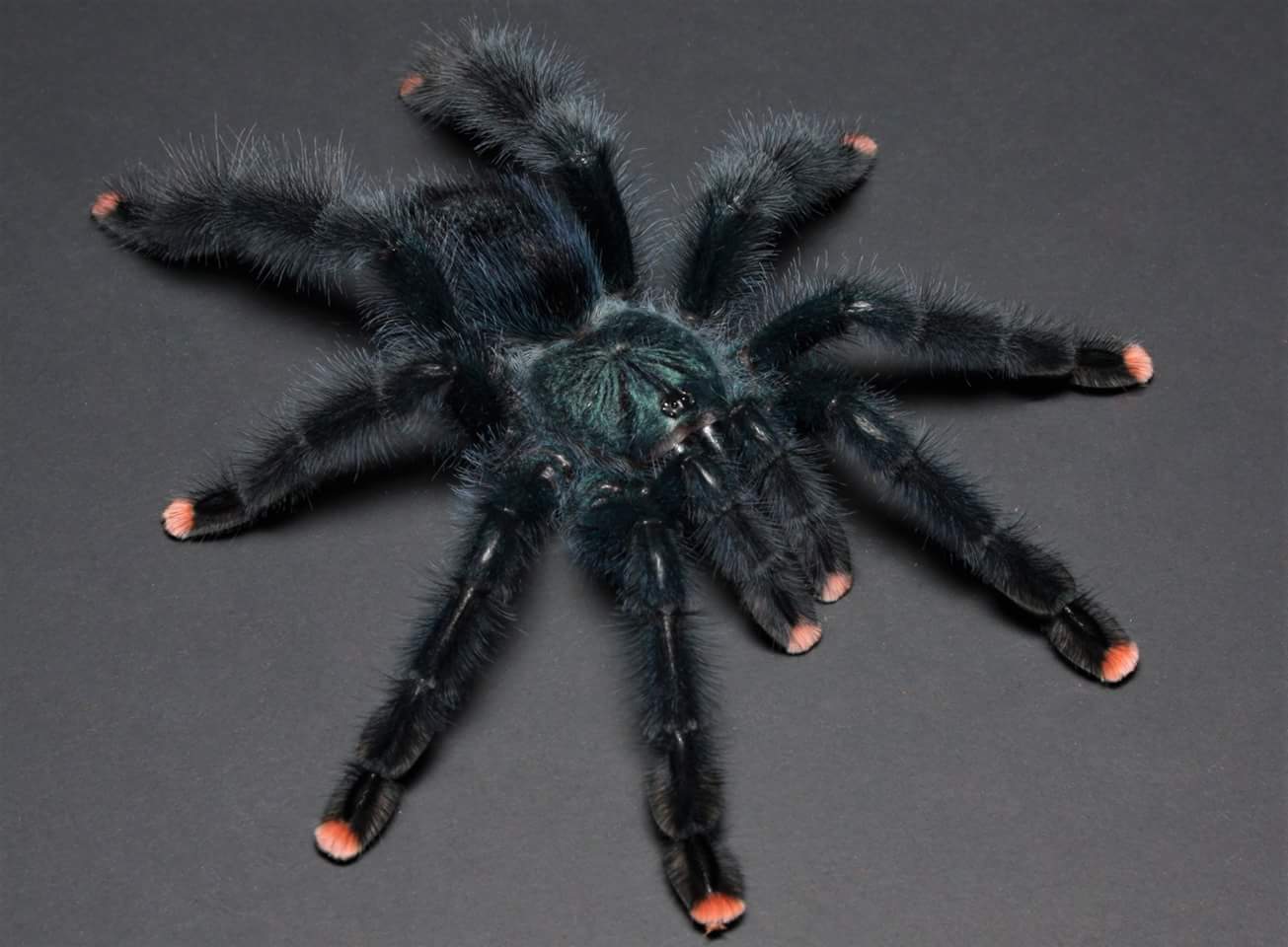 Паук средних размеров. Длина тела составляет 6 см, а лапы – до 15 см. Живёт он сравнительно недолго – самки около 10 лет, самцы 2-3 года. Животное черного цвета, но брюшка переливается фиолетовым и темно-зеленым отливом. Кончики лап – розового цвета.