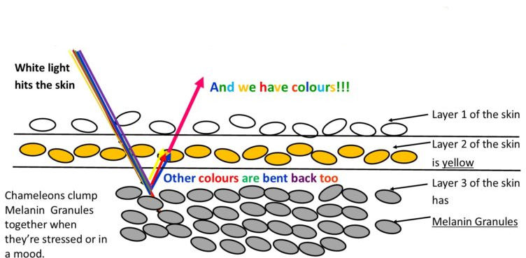 Разнообразные оттенки получаются при комбинировании пигментных зерен обоих слоев — поверхностного и глубокого. Интересен характер появления зеленых тонов: это связано с преломлением лучей во внешнем слое, содержащем много светопреломляющих кристаллов. Из-за этого цвет хамелеона может быстро меняться: от светлого — через разные яркие виды оранжевого, зеленого, фиолетового — до черного. Причем он может меняться как по всей длине тела рептилии, так и отдельными полосами и пятнами.