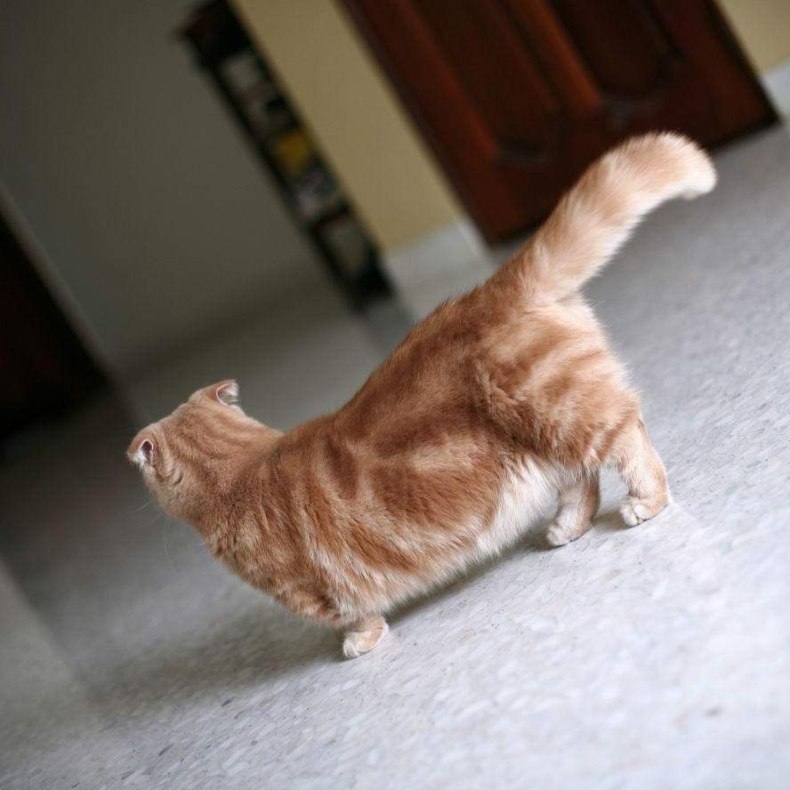 Манчкин может сидеть «столбиком» очень долго: вытягивает шею, свешивает маленькие лапки — в этом момент он и впрямь походит на кенгуру.
