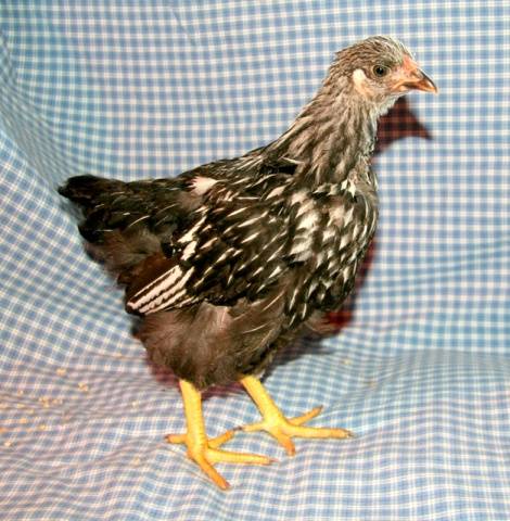 Цыпленок серебристо-окаймленный в начале обрастания юношеским пером.