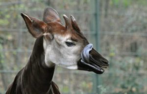 Интересный факт! Серо-синий, как у жирафа, язык окапи в длину достигает 35 см. Чистоплотное животное легко смывает им грязь из глаз и ушей.