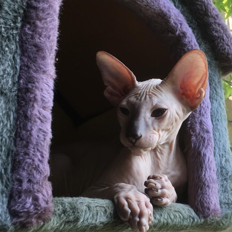- Несмотря на отсутствие богатого шерстного покрова, петерболд не является гипоаллергенной кошкой. В его слюне присутствует такое же количество белка Fel D1, что и у представителей других пород.