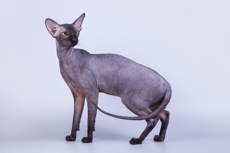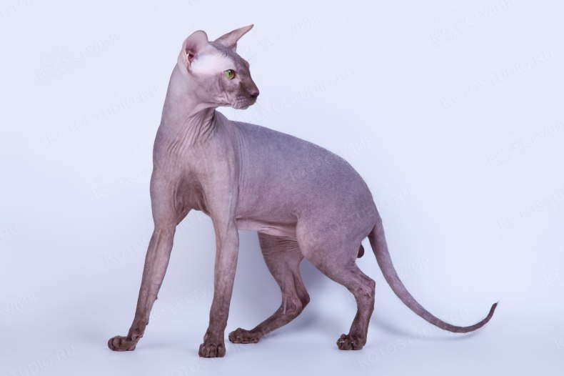 Стандарт у петербургского сфинкса такой же, как и у сиама или ориентала. Туловище длинное, мускулистое и гибкое. Шея пропорциональна размерам тела, стройная. Плечи и бёдра одинаковой ширины. На высоких, изящных лапах расположены толстые, овальные подушечки с вытянутыми пальцами, из-за этого шаги кошки становятся неслышными. Особо заметная деталь внешности сфинкса – очень тонкий, длинный хвост, похожий на хлыст.