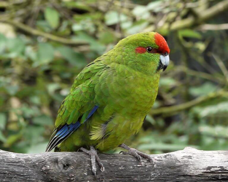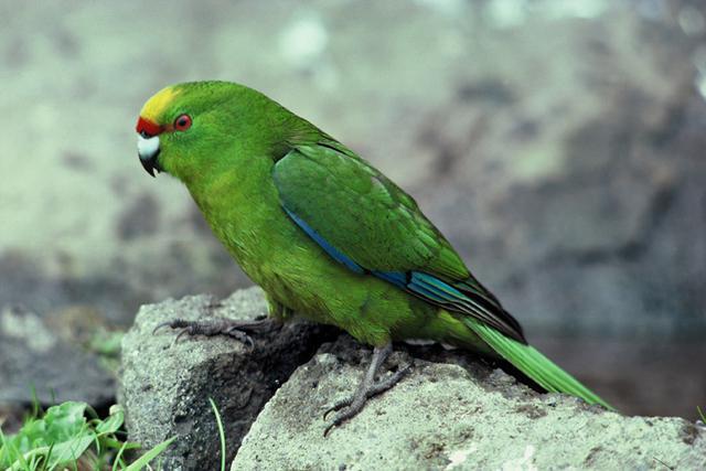 - Краснолобый прыгающий попугай (лат. Cyanoramphus novaezelandiae) — самый популярный какарик для содержания в неволе. Основной цвет оперения — темно-зеленый, но в ходе мутации птица поменяла окрас на ярко-желтый. Фото именно этой разновидности попугая с измененной расцветкой чаще всего можно найти в интернете. Шапочка на голове и горизонтальная полоска красного цвета, пересекающая глаза, характерны для «новозеландцев» с обеими вариантами расцветки. У попугая с природным зеленым окрасом синее подхвостье, такого же цвета окантовка контурных и маховых перьев.