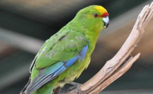 - Желтолобый прыгающий попугай (лат. Cyanoramphus auriceps) — птичка с ярким зеленым оперением. Из-за желтого пятна на лбу пернатых иногда путают с барабандовыми или щитовидными попугаями, хотя, если присмотреться, общего у этих двух видов мало. На надхвостье небольшие красные пятна, полоса такого же оттенка украшает основание клюва. Кончик его черный, а сам клюв голубоватого цвета.