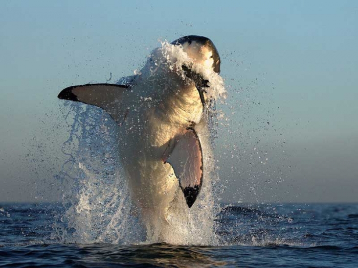 Самая крупная и свирепая из современных хищников — белая акула — имеет обтекаемую форму тела, мощный серпообразный хвост, три крупных плавника, пять пар вертикальных жаберных щелей, огромную пасть, высокую скорость передвижения и жестокий нрав.