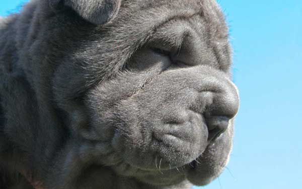 - Голова крупная, широкая, челюсти мощные. Мочка носа толстая, ее цвет обусловлен окрасом собаки. На лбу, морде кожа собрана в складки, которые на шее образуют своеобразный подвес.