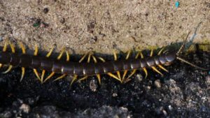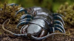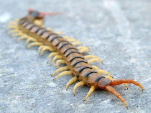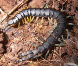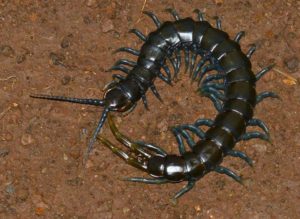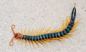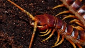 Насекомоядная сколопендра обладает 42-46 пар ног, в любой из них располагается железа с ядом.