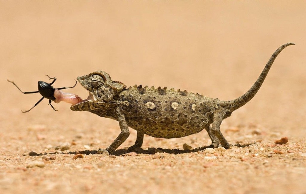 Знаете ли вы, что глаза хамелеона могут по отдельности смотреть в совершенно разные стороны, а также вращаться в разные стороны. Их поле зрения составляет 360 градусов, поэтому они могут видеть свою добычу даже за спиной, или разные предметы с разных сторон тела. При этом, чтобы полакомиться чем-нибудь вкусненьким, хамелеоны медленно меняют положение, замирают на некоторое время, а затем совершенно неожиданно высвобождают свой длинный язык с присоской (почти такой же, как и вся длина тела), что заставляет его можно взять еду.