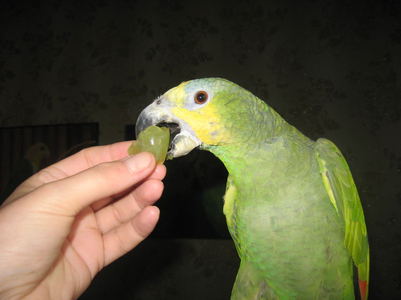 Амазоны — заядлые обжоры. Поэтому владельцам необходимо разработать полноценный рацион так, чтобы попугай получал необходимые питательные компоненты и не переедал.