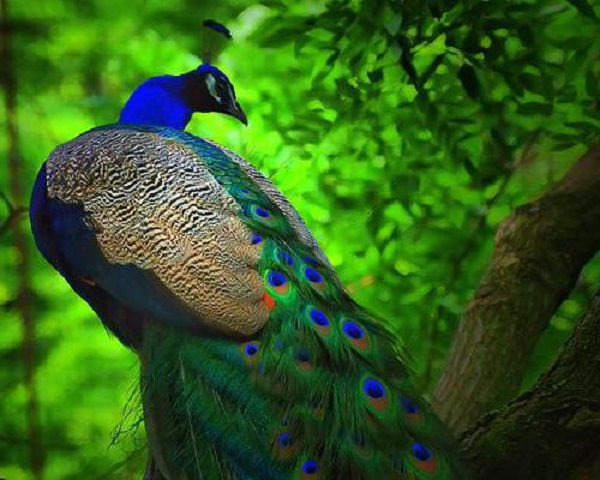 Павлины — это птицы с яркими перьями синего или изумрудного цвета.