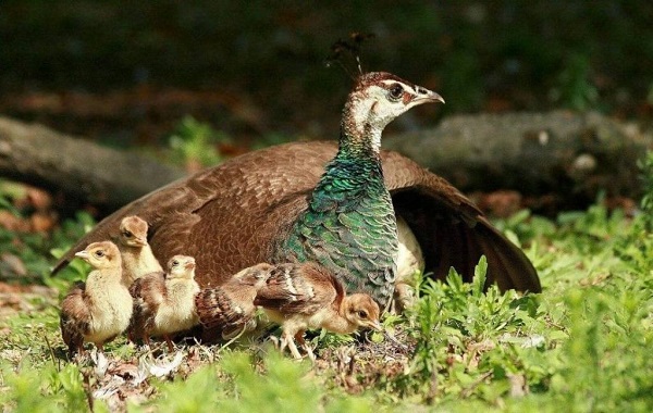 Дополнительная информация! Самки павлинов не любят высиживать яйца, они их подкладывают под других птиц. Но зато, когда появляется потомство, павы трепетно заботятся о маленьких павлинах, учат выживать и греют их зимой.